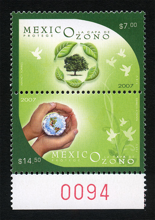 No. Scott: 2550 -- Año de Emisión: 2007 -- Valor Facial: $ 21.50 -- Multicolor -- Perforación:13 1/4 x 13 -- Tipo de Impresión: Offset Tira de Dos Timbres Postales multicolor, alusivos a la Protección de la Capa de Ozono, en el primero se observa un árbol frondoso rodeado de cinco hojas color verde, en el segundo aparecen dos manos humanas sosteniendo una esfera pequeña adornada con objetos pequeños, en ambos timbres se perciben varias siluetas de colibríes en vuelo. Sobre las estampillas está escrito "MÉXICO PROTEGE LA CAPA DE OZONO", el valor facial y "NANCY TORRES, TIEV, 2007". Para más información favor de dirigirse a biblioteca@mufi.org.mx