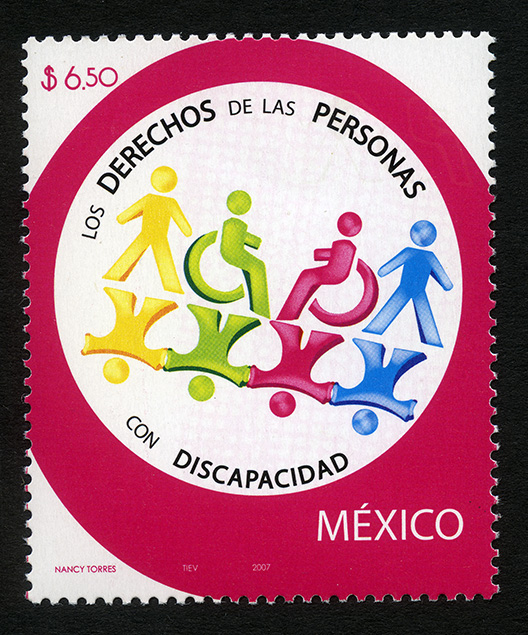 No. Scott: 2554 -- Año de Emisión: 2007 -- Valor Facial: $ 6.50 -- Multicolor -- Perforación: 13 x 13 1/4 -- Tipo de Impresión: Offset Timbre Postal Mexicano multicolor, en la imagen se observa un fondo color fucsia y sobre él, aparece un círculo color blanco con dos hileras de siluetas humanas, en ellas hay dos sillas de ruedas, que representa la discapacidad de las personas que no pueden caminar. Sobre la estampilla está escrito el valor facial de "$6.50", "LOS DERECHOS DE LAS PERSONAS CON DISCAPACIDAD", "MÉXICO" y "NANCY TORRES, TIEV, 2007". Para más información favor de dirigirse a biblioteca@mufi.org.mx