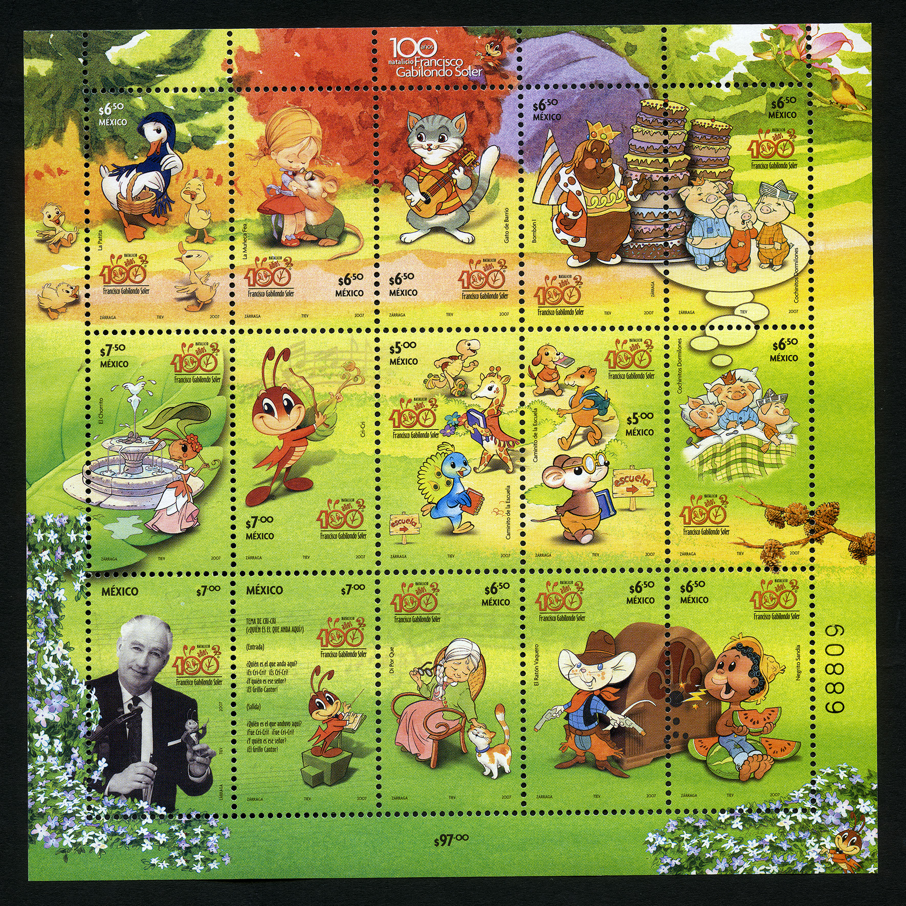 No. Scott: 2555 -- Año de Emisión: 2007 -- Valor Facial: $ 97.00 -- Multicolor -- Perforación:13 1/4 x-13 -- Tipo de Impresión: OffsetHoja de quince Timbres Postales multicolor de México, alusiva a los 100 años del Natalicio de Francisoco Gabilonso Soler, en cada timbre aparecen imágenes representando algunas de sus canciones compuestas por él como La Patita, La Muñeca Fea, Gato de Barrio, Bombón I, Cochinitos Dormilones, El Chorrito, Cri-Cri, Caminito de la Escuela, Dí Porqué, El Ratón Vaquero y Negrito Sandía. En cada estampilla está escrito "MÉXICO", el valor facial, el nombre de las canciones y "ZÁRRAGA, TIEV, 2007".