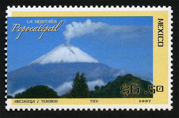 No. Scott: 2562 -- Año de Emisión: 2007 -- Valor Facial: $ 6.50 -- Multicolor -- Perforación:13 1/4 x 13 -- Tipo de Impresión: Offset Timbre Postal Mexicano multicolor, al fondo de la imagen, se observa una montaña de gran tamaño y punta muy pronunciada, en la cuál , al frente aparece parte de arboles frondosos y muy verdes. Sobre la estampilla está escrito "LA MONTAÑA POPOCATÉPETL", "MÉXICO", el valor facial de "$6.50" y "ARCINIEGA / TENORIO / TIEV / 2007". Para más información favor de dirigirse a biblioteca@mufi.org.mx