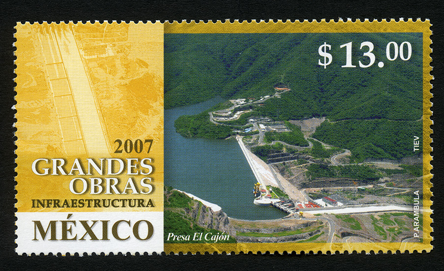 No. Scott: 2571 -- Año de Emisión: 2007 -- Valor Facial: $ 13.00 -- Multicolor -- Perforación:13 1/4 x 13 -- Tipo de Impresión: Offset Timbre Postal Mexicano multicolor, alusivo a Grandes Obras de Infraestructura, mediante una toma aérea se observa la presa El Cajón, la cual es una central hidroeléctrica, ubicada en el cauce del Río Grande de Santiago, en el municipio de Santa María del Oro, Nayarit. En la estampilla está escrito el valor facial de "$13.00", "2007 MÉXICO" y "P. ARÁMBULA, TIEV". Para más información favor de dirigirse a biblioteca@mufi.org.mx