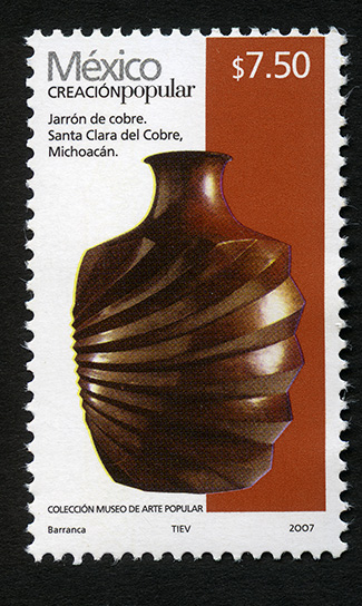 No. Scott: 2500b -- Año de Emisión: 2007 -- Valor Facial: $ 7.50 -- Multicolor -- Perforación: 13 1 /4 x 13 -- Tipo de Impresión: Offset Estucado Timbre Postal Mexicano multicolor, perteneciente a la serie permanente México Creación Popular, en la imagen se observa un recipiente en forma de vaso alto, copa o jarro grande, hecho de cobre y elaborado en el Estado de Michoacán. En la estampilla está escrito "México CREACIÓN POPULAR", el valor facial de "$ 7.50", "Jarrón de cobre. Santa Clara del Cobre, Michoacán", "COLECCIÓN MUSEO DE ARTE POPULAR" y "Barranca, TIEV, 2007". Para más información favor de dirigirse a biblioteca@mufi.org.mx