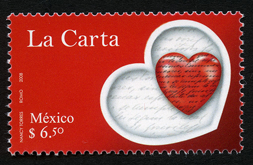 No. Scott: 2572 -- Año de Emisión: 2008 -- Valor Facial: $ 6.50 -- Multicolor -- Perforación: 13 1 /2 y 13 1/4 -- Tipo de Impresión: Offset Timbre Postal Mexicano multicolor, sobre un fondo color rojo, se observa un corazón en tercera dimensión, con palabras escritas que no son legibles, sobre de él aparece otro corazón de menor tamaño en tono rojo. Sobre la estampilla está escrito "La Carta", "México", el valor facial de "$6.50" y "NANCY TORRES, TIEV, 2008". Para más información favor de dirigirse a biblioteca@mufi.org.mx
