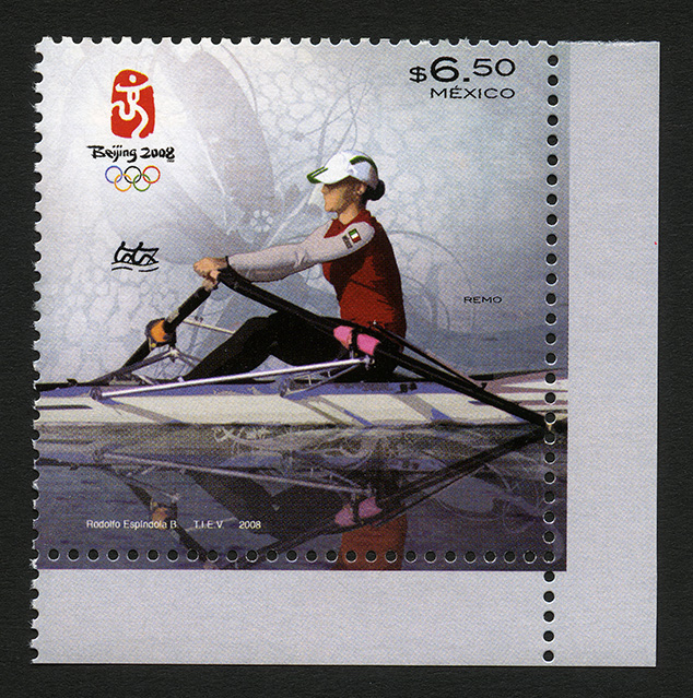 No. Scott: 2577 -- Año de Emisión: 2008 -- Valor Facial: $ 6.50 -- Multicolor -- Perforación: 13 -- Tipo de Impresión: Offset Timbre Postal Mexicano multicolor, en la imagen se observa a una mujer joven vestida con ropa deportiva, en la cabeza lleva puesta una gorra color blanco, ella vá sentada moviendo una embarcación en el agua, al parecer va utilizando dos remos. Sobre la estampilla está escrito el valor facial de "$6.50", "MÉXICO", "REMO", "Rodolfo Espíndola B. TIEV. 2008", también aparece impreso el logotipo de "Beijing 2008" y los Cinco anillos Olímpicos. Para más información favor de dirigirse a biblioteca@mufi.org.mx