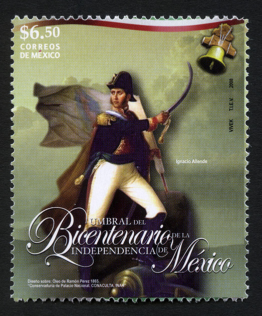 No. Scott: 2582 -- Año de Emisión: 2008 -- Valor Facial: $ 6.50 -- Multicolor -- Perforación: 13 x 13 1/4 -- Tipo de Impresión: OffsetTimbre Postal Mexicano multicolor, en el centro de la imagen se observa a Ignacio Allende, Militar e Insurgente mexicano que se destacó como uno de los caudillos principales en la primera etapa de la Guerra de la Independencia, él permanece de pie, con las piernas separadas, un pie lo está apoyando sobre un escalón, en una mano está cargando una bandera y en la otra un sable, en la parte superior se aprecia una campana color plata e incrustación en madera. Sobre la estampilla está escrito el valor facial de "$6.50", "CORREOS DE MÉXICO", "Ignacio Allende", "UMBRAL DEL BICENTENARIO DE LA INDEPENDENCIA DE MÉXICO" y "VIVEK, TIEV, 2008".
