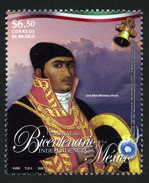 No. Scott: 2584 -- Año de Emisión: 2008 -- Valor Facial: $ 6.50 -- Multicolor -- Perforación: 13 x 13 1/4 -- Tipo de Impresión: OffsetTimbre Postal Mexicano multicolor, en el centro de la imagen se observa el retrato de José María Morelos y Pavón, quien fue sacerdote y militar insurgente, él aparece de la cabeza hasta la mitad del pecho, porta un uniforme de militar en varios colores, al parecer, en las manos lleva un escudo y una espada, en la cabeza lleva puesto un paliacate color negro, en la parte superior se aprecia una campana color plata e incrustación en madera. Sobre la estampilla está escrito el valor facial de "$6.50", "CORREOS DE MÉXICO", "José María Morelos y Pavón", "UMBRAL DEL BICENTENARIO DE LA INDEPENDENCIA DE MÉXICO" y "VIVEK, TIEV, 2008".
