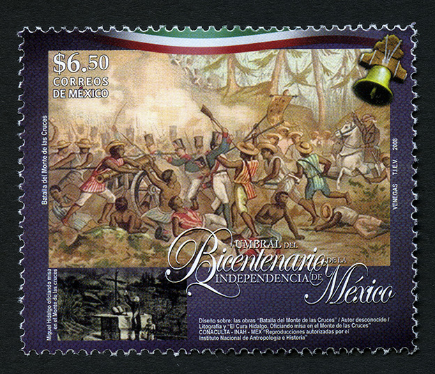 No. Scott: 2585 -- Año de Emisión: 2008 -- Valor Facial: $ 6.50 -- Multicolor -- Perforación: 13 x 13 1/4 -- Tipo de Impresión: OffsetTimbre Postal Mexicano multicolor, en él se observa una imagen de la Batalla de las Cruces, la cual sucedió entre las fuerzas del Ejército Insurgente dirigidas por Miguel Hidalgo, Ignacio Allende y Juan Aldama, contra las fuerzas de España, en la parte inferior del lado izquierdo aparece una pequeña ilustración en blanco y negro del Monte de las Cruces, en la cual está Miguel Hidalgo oficiando una misa. Sobre la estampilla está escrito el valor facial de "$6.50", "CORREOS DE MÉXICO", "UMBRAL DEL BICENTENARIO DE LA INDEPENDENCIA DE MÉXICO" y "VENEGAS, TIEV, 2008".