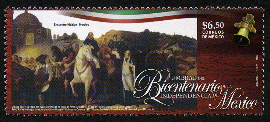 No. Scott: 2587 -- Año de Emisión: 2008 -- Valor Facial: $ 6.50 -- Multicolor -- Perforación: 13 x 13 1/4 -- Tipo de Impresión: OffsetTimbre Postal Mexicano multicolor, en él se observa una imagen del encuentro que tuvieron Miguel Hidalgo y José María Morelos, en el cual Morelos alcanza a Hidalgo en el pueblo del Charo, quien marchaba con sus tropas insurgentes y se pone al servicio de la Independencia. Sobre la estampilla está escrito "Encuentro Hidalgo-Morelos", el valor facial de "$6.50", "CORREOS DE MÉXICO", "UMBRAL DEL BICENTENARIO DE LA INDEPENDENCIA DE MÉXICO" y "LUIS JAIME, TIEV, 2009".