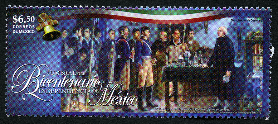 No. Scott: 2588 -- Año de Emisión: 2008 -- Valor Facial: $ 6.50 -- Multicolor -- Perforación: 13 x 13 1/4 -- Tipo de Impresión: OffsetTimbre Postal Mexicano multicolor, en él se observa una imagen de la Conspiración de Queretaro, en la cual aparece un gran número de personas dentro de una habitación, algunos están vestidos de civiles y otros portan un uniforme de militar, al parecer están en una reunión, en medio hay una mesa con objetos y algunas botellas, del lado derecho se aprecia al Insurgente mexicano Miguel Hidalgo y Costilla. Sobre la estampilla está escrito el valor facial de "$6.50", "CORREOS DE MÉXICO", "Conspiración de Querétaro", "UMBRAL DEL BICENTENARIO DE LA INDEPENDENCIA DE MÉXICO" y "LUIS JAIME, TIEV, 2008".