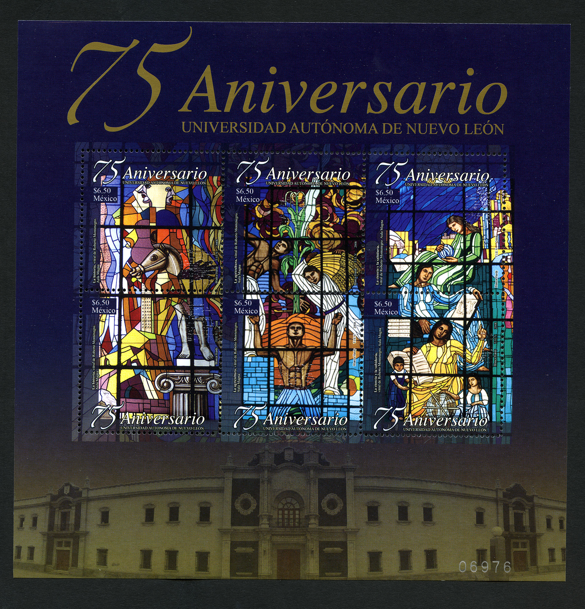 No. Scott: 2592 -- Año de Emisión: 2008 -- Valor Facial: $ 39.00 -- Multicolor -- Perforación: 13 -- Tipo de Impresión: OffsetHoja Recuerdo multicolor con seis Timbres Postales de México, en la parte superior de la hoja está escrito 75 ANIVERSARIO UNIVERSIDAD AUTÓNOMA DE NUEVO LEÓN, en la parte inferior se observa la fachada de la Universidad, al centro aparecen seis timbres con imágenes elaboradas en vitrales, por el artista Roberto Montenegro, los dos primeros representan el tema de La Historia, los de en medio de La Agricultura y los últimos La Ciencia y La Sabiduría. Sobre la estampilla está escrito el valor facial de "$6.50", "México", el motivo, "75 Aniversario UNIVERSIDAD AUTÓNOMA DE NUEVO LEÓN" y Blanca Hardy, TIEV, 2008".