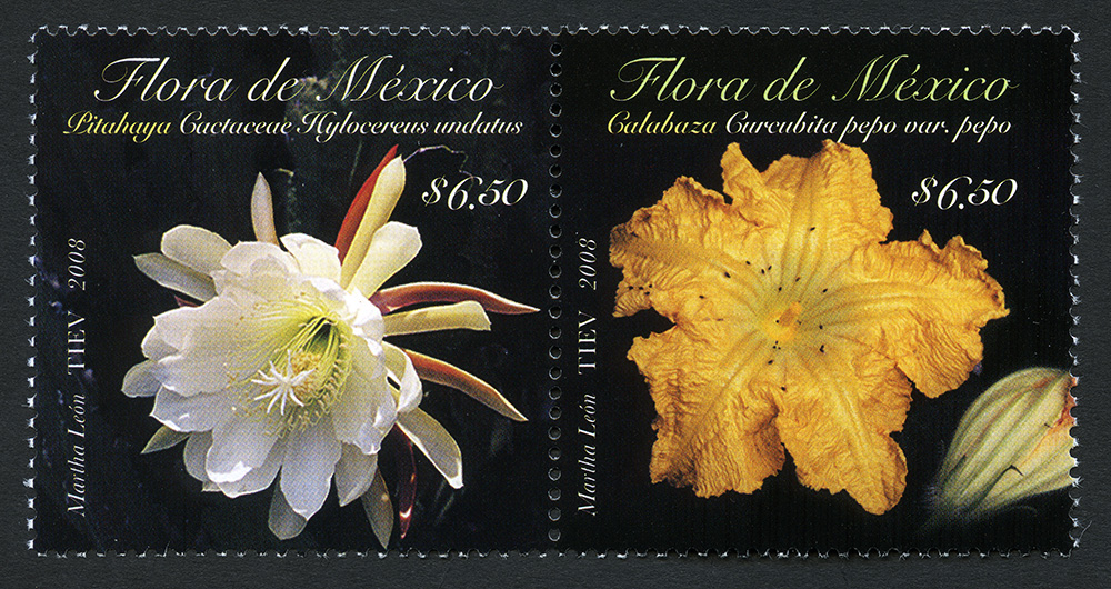 No. Scott: 2594 -- Año de Emisión: 2008 -- Valor Facial: $ 13.00 -- Multicolor -- Perforación: 13 -- Tipo de Impresión: Offset Tira de dos Timbres Postales multicolor de México, en la primera imagen se observa una flor perteneciente a la Pitaya, la cual tiene forma de trompeta y es color blanco, en la segunda aparece la flor de la calabaza, de pétalos muy grandes brillantes en color amarillo, se pueden comer crudas o cocidas y son muy ricas en calcio. En cada estampilla está escrito "Flora de México", Pitaya Hylocereus Undulatus, Calabaza Curcubita Pepo, el valor facial de "$6.50" y "Martha León, TIEV, 2008". Para más información favor de dirigirse a biblioteca@mufi.org.mx