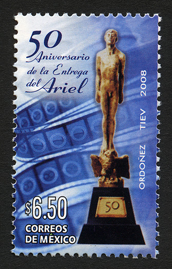 No. Scott: 2613 -- Año de Emisión: 2008 -- Valor Facial: $ 6.00 -- Multicolor -- Perforación: 13 1/4 x 13 -- Tipo de Impresión: OffsetTimbre Postal Mexicano multicolor, al fondo de la imagen se observa un gran número de cintas cinematográficas en colores azul y blanco, al frente se aprecia la estatua del Ariel, representada por un hombre desnudo en posición de emprender el vuelo, diseñada por el escultor mexicano Ignacio Asúnsolo, la cual es otorgada a individuos e instituciones en reconocimiento de su trayectoria en cine. Sobre la estampilla está escrito "50 Aniversario de la Entrega del Ariel ", el valor facial de "$6.50", "CORREOS DE MÉXICO" y "ORDOÑEZ, TIEV, 2008".
