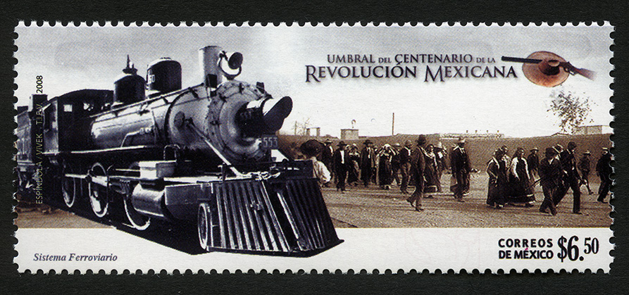 No. Scott: 2603 -- Año de Emisión: 2008 -- Valor Facial: $ 6.50 -- Multicolor -- Perforación: 13 1/4 x 13 -- Tipo de Impresión: OffsetTimbre Postal Mexicano multicolor, la imagen representa un paisaje de la Revolución Mexicana en donde se observa un medio de transporte formado por vagones y arrastrado por una locomotora que avanza sobre vías o rieles, del lado derecho aparece una gran cantidad de personas que van caminando, en mi opinión y por la vestimenta que llevan, pertenecían a las clases alta y media, al fondo de aprecia una barda de gran tamaño. Sobre la estampilla está escrito "UMBRAL DEL CENTENARIO DE LA REVOLUCIÓN MEXICANA", "ESPÍNDOLA, VIVEK, TIEV, 2008", "Sistema Ferroviario", "CORREOS MÉXICO" y el valor facial de "$6.50".