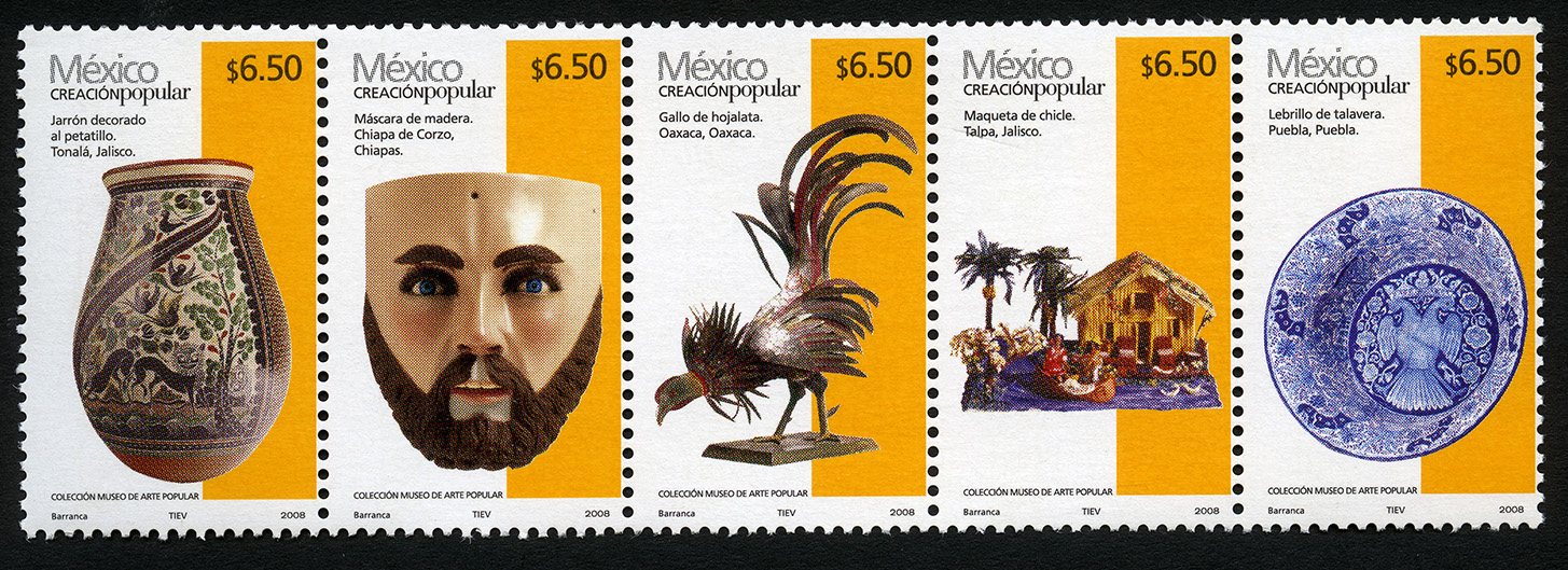 No. Scott: 2498c -- Año de Emisión: 2008 -- Valor Facial: $ 32.50 -- Multicolor -- Perforación: 13 1 /4 x 13 -- Tipo de Impresión: Offset EstucadoSerie de cinco Timbres Postales multicolor, pertenecientes a la colección permanente México Creación Popular, en la primera estampilla se observa una máscara de madera, originaria de Chiapa de Corzo, en la segunda aparece un gallo de hojalata, perteneciente al estado de Oaxaca, en la tercera hay una maqueta de chicle realizada en Talpa, Jalisco, en la cuarta se aprecia un lebrillo de talavera, procedente de Puebla y en la quinta aparece un jarrón decorado al petatillo de Tonalá Jalisco. En cada timbre está escrito "México CREACIÓN popular", el valor facial de "$6.50", el nombre y origen de cada pieza, "COLECCIÓN MUSEO ARTE POLPULAR" Y "Barranca, TIEV, 2008".