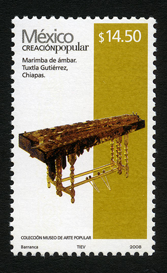 No. Scott: 2504c -- Año de Emisión: 2008 -- Valor Facial: $ 14.50 -- Multicolor -- Perforación: 13 1 /4 x 13 -- Tipo de Impresión: Offset Estucado Timbre Postal Mexicano multicolor, perteneciente a la serie permanente México Creación Popular, en la imagen se observa un instrumento de percusión auditivo elaborado de ámbar y decorado artísticamente, mismo fue realizado en el estado de Chiapas. Sobre la estampilla está escrito "México CREACIÓN POPULAR", el valor facial de "$ 14.50", "Marimba de ámbar. Tuxtla Gutiérrez, Chiapas", "COLECCIÓN MUSEO DE ARTE POPULAR" y "Barranca, TIEV, 2008". Para más información favor de dirigirse a biblioteca@mufi.org.mx
