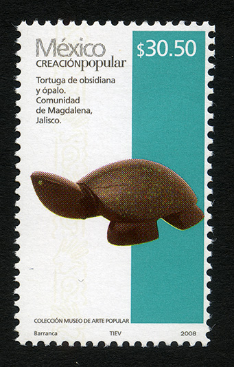 No. Scott: 2505c -- Año de Emisión: 2008 -- Valor Facial: $ 30.50 -- Multicolor -- Perforación: 13 1 /4 x 13 -- Tipo de Impresión: Offset Estucado Timbre Postal Mexicano multicolor, perteneciente a la serie permanente México Creación Popular, en la imagen se observa una tortuga de obsidiana y ópalo, realizada en la Comunidad de Magdalena, Jalisco. Sobre la estampilla está escrito "México CREACIÓN POPULAR", el valor facial de "$ 30.50", "Tortuga de obsidiana y ópalo", "COLECCIÓN MUSEO DE ARTE POPULAR" y "Barranca, TIEV, 2008". Para más información favor de dirigirse a biblioteca@mufi.org.mx