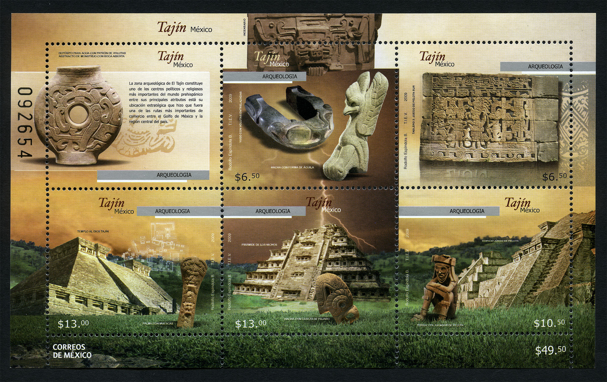 No. Scott: 2616 -- Año de Emisión: 2009 -- Valor Facial: $ 49.50 -- Multicolor -- Perforación: 13 1/4 x 13 -- Tipo de Impresión: OffsetHoja Recuerdo Multicolor con 5 Timbres Postales de México, alusivos a la Zona Arqueológica de Tajín, en la etiqueta de introducción aparece una pieza de arqueología titulado Depósito para Agua con Patrón de Volutas Abstracto de Monstruo con Boca Abierta, en el primer timbre se observa un Yugo con Volutas Entrelazadas, en el segundo El Tablero 3, Juego de Pelota Sur, en el tercero se aprecia El Templo al Dios Tajín, en el cuarto está La Pirámide de los Nichos y en el último El Edificio Juego de Pelota. En cada estampilla está escrito ARQUEOLOGÍA", "Tajín de México", "Rodolfo Espíndola, TIEV, 2009" y el valor facial de cada timbre.