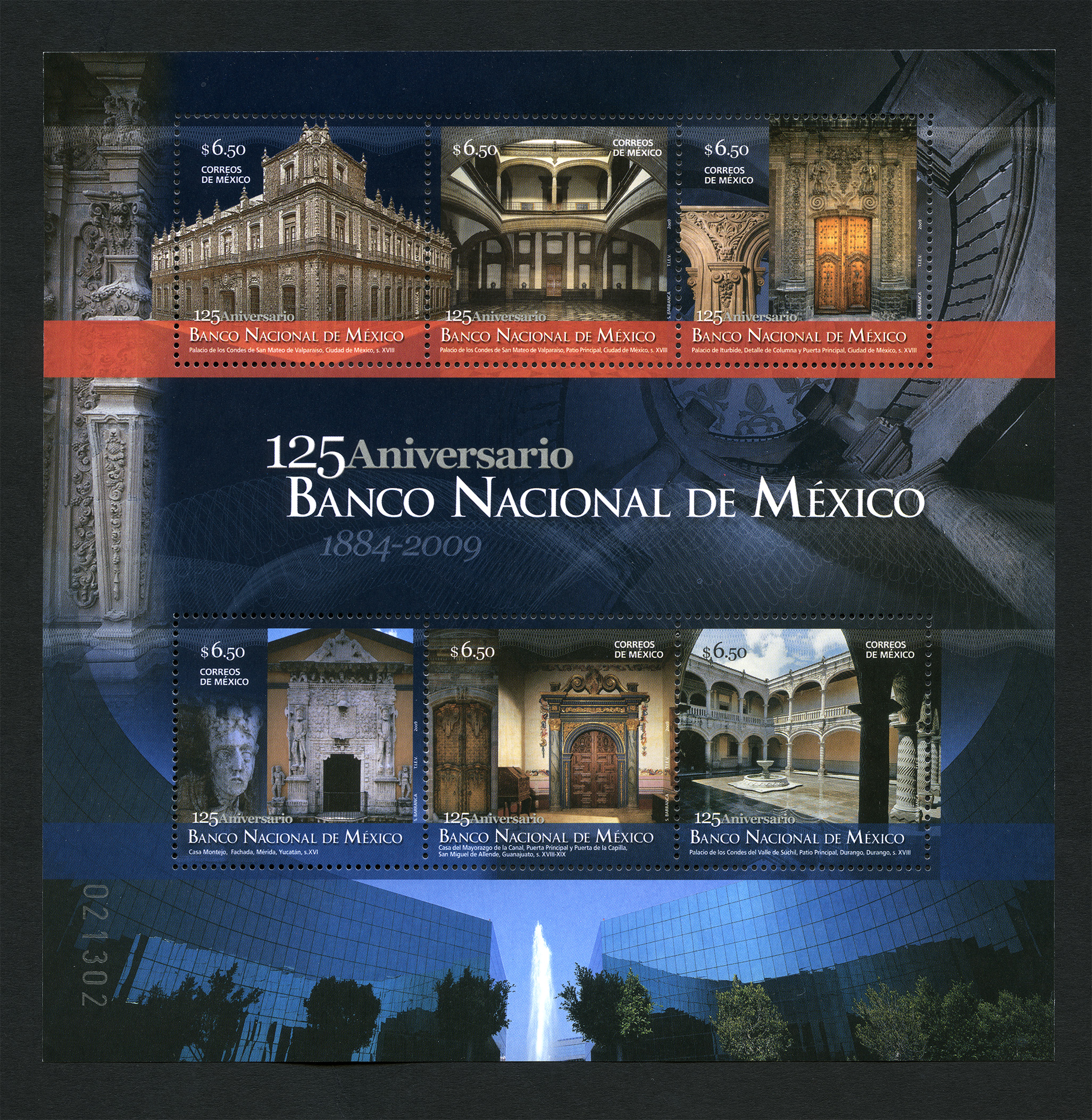 No. Scott: 2619 -- Año de Emisión: 2009 -- Valor Facial: $ 39.00 -- Multicolor -- Perforación: 13 -- Tipo de Impresión: OffsetHoja Recuerdo multicolor con seis Timbres Postales multicolor de México, alusivos al 125 Aniversario del Banco Nacional de México, en los timbres uno y dos, se observa la fachada y el interior del Palacio de los Condes de San Mateo de Valparaíso en la Ciudad de México, en el tercero aparece la puerta principal y detalle de columna del Palacio de Iturbide ubicado en la ciudad de México, en el cuarto se aprecia la fachada de Casa Montejo en Mérida Yucatán, en el quinto se observa la puerta principal y puerta de la capilla de La Casa de Mayorazgo de la Canal en San Miguel de Allende, Guanajuato y en el último se muestra el Patio Principal del Palacio de los Condes del Valle de Súchil en Durango, Durango. En cada estampilla está escrito el valor facial , "CORREOS DE MÉXICO", "125 Aniversario DEL BANCO DE MÉXICO" Y "S. BARRANCA, TIEV, 2009".