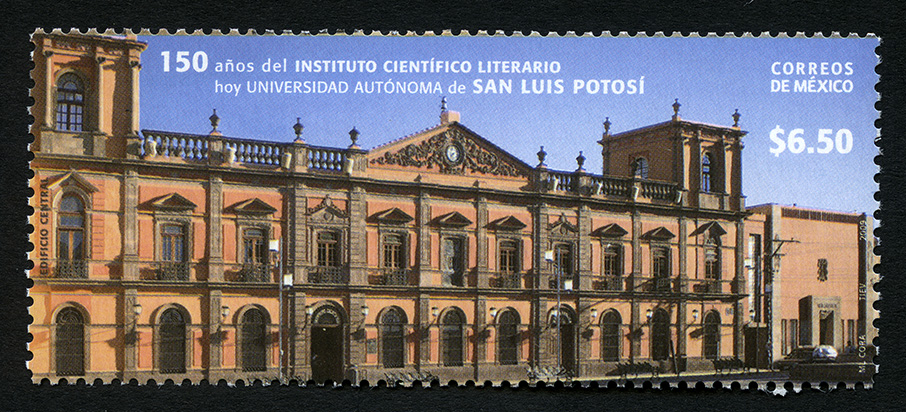 No. Scott: 2638 -- Año de Emisión: 2009 -- Valor Facial: $ 6.50 -- Multicolor -- Perforación: 13 1/4 x 13 -- Tipo de Impresión: OffsetTimbre Postal Mexicano multicolor, en la imagen se observa la fachada del edifico central de la Universidad Autónoma de San Luis Potosí, misma que muestra un estilo Neoclásico, basado en la pureza de las líneas arquitectónicas y la simetría y en proporciones sujetas a las leyes de las matemáticas. Sobre la estampilla está escrito "150 años del INSTITUTO CIENTÍFICO LITERARIO hoy UNIERSIDAD AUTÓNOMA DE SAN LUIS POTOSÍ", "CORREOS DE MÉXICO", el valor facial de "$6.50" y "M. CORA, TIEV, 2009".