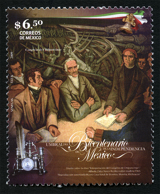 No. Scott: 2627 -- Año de Emisión: 2009 -- Valor Facial: $ 6.50 -- Multicolor -- Perforación:13 x 13 1/4 -- Tipo de Impresión: Offset Timbre Postal Mexicano multicolor, alusivo al Bicentenario de la Independencia de México, la imagen representa el primer congreso independiente que sustituyó a la Junta de Zitácuaro, convocado por José María Morelos y Pavón. En la estampilla está escrito el valor facial de "$6.50", "CORREOS DE MÉXICO", "VENEGAS, TIEV, 2009", "Congreso de Chilpancingo" y "UMBRAL DEL BICENTENARIO DE LA INDEPENDENCIA DE MÉXICO". Para más información favor de dirigirse a biblioteca@mufi.org.mx