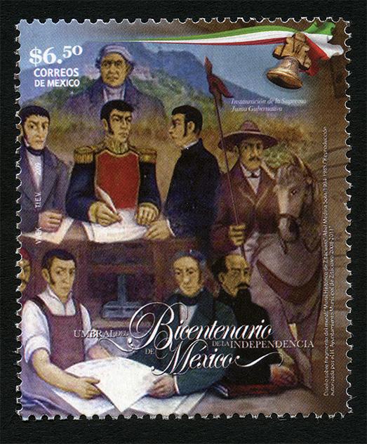 No. Scott: 2628 -- Año de Emisión: 2009 -- Valor Facial: $ 6.50 -- Multicolor -- Perforación:13 x 13 1/4 -- Tipo de Impresión: OffsetTimbre Postal Mexicano multicolor, alusivo al Bicentenario de la Independencia de México, en la imagen se aprecia una junta de Gobierno creada por los Insurgentes Mexicanos en el marco de la Guerra de Independencia, en ella se observa a los militares Ignacio López Rayón y José María Liceaga, con el nombre de Suprema Junta Nacional Americana éstos militares formularon la convocatoria mediante acta el 19 de Agosto de 1811 en Zitácuaro. Sobre la estampilla está escrito el valor facial de "$6.50", "CORREOS DE MÉXICO", "Instauración de la Suprema Junta Gubernativa", "VIVEK, TIEV, 2009" y "UMBRAL DEL BICENTENARIO DE LA INDEPENDENCIA DE MÉXICO".