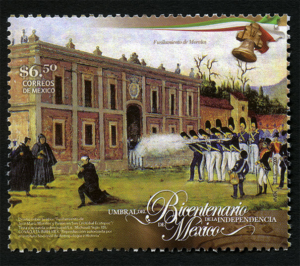 No. Scott: 2630 -- Año de Emisión: 2009 -- Valor Facial: $ 6.50 -- Multicolor -- Perforación: 13 1/4 x 13 -- Tipo de Impresión: OffsetTimbre Postal Mexicano multicolor, alusivo al Bicentenario de la Independencia de México, la imagen representa el fusilamiento de José María Morelos y Pavón, quien fue un religioso, político y militar mexicano caudillo de la Independencia de México, este acontecimiento sucedió el 22 de Diciembre de 1815 en San Cristóbal Ecatepec. Sobre la estampilla está escrito "Fusilamiento de Morelos", el valor facial de "$6.50", "CORREOS DE MÉXICO", "VIVEK, TIEV, 2009" y "UMBRAL DEL BICENTENARIO DE LA INDEPENDENCIA DE MÉXICO".