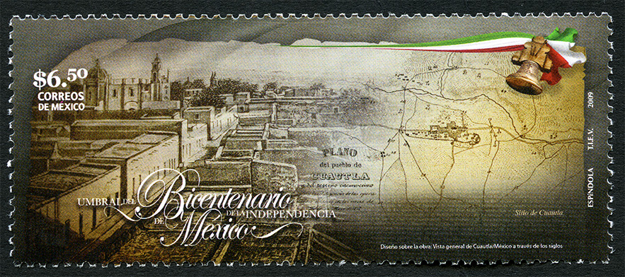 No. Scott: 2633 -- Año de Emisión: 2009 -- Valor Facial: $ 6.50 -- Multicolor -- Perforación: 13 1/4 x 13 -- Tipo de Impresión: OffsetTimbre Postal Mexicano multicolor, alusivo al Bicentenario de la Independencia de México, en la imagen se observa el pueblo y el plano de Cuautla de Morelos, lugar en donde José María Morelos realizó campaña militar, cuando el ejército bajó su mando fue sitiado en la población de Cuautla de Morelos por las tropas realistas comandadas por Félix María Calleja. En la estampilla está escrito el valor facial de "$6.50", "CORREOS DE MÉXICO", "Sitio de Cuautla", "ESPÍNDOLA, TIEV, 2009" y "UMBRAL DEL BICENTENARIO DE LA INDEPENDENCIA DE MÉXICO".
