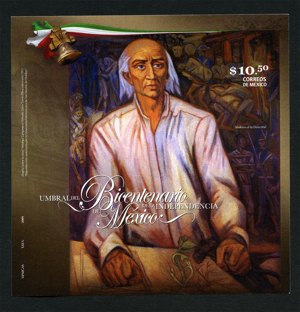 No. Scott: 2636 -- Año de Emisión: 2009 -- Valor Facial: $ 10.50 -- Multicolor -- Perforación: 13 1/4 x 13 -- Tipo de Impresión: OffsetTimbre Postal Mexicano multicolor, alusivo al Bicentenario de la Independencia de México, en él se observa una obra del dibujante y muralista Alfredo Zalce Torres, titulada "Hidalgo Campesino", al fondo aparecen varias escenas proyectando la esclavitud, en primer plano aparece Miguel Hidalgo y Costilla, sentado de frente, con las manos apoyadas sobre la mesa. En la estampilla está escrito el valor facial de "$10.50", "CORREOS DE MÉXICO", "UMBRAL DEL BICENTENARIO DE LA INDEPENDENCIA DE MÉXICO" y "VENEGAS, TIEV, 2009".