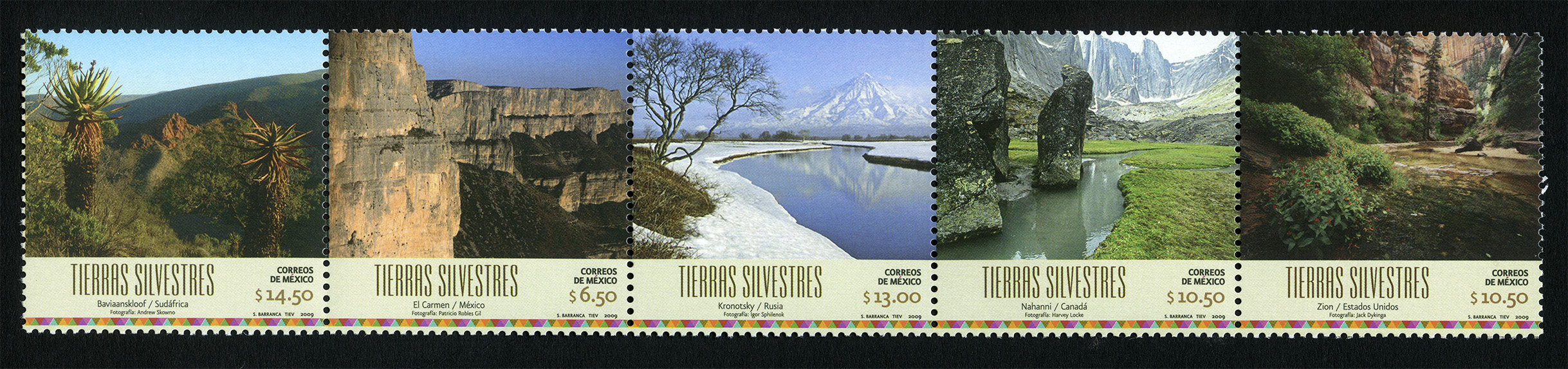 No. Scott: 2644 -- Año de Emisión: 2009 -- Valor Facial: $ 55.00 -- Multicolor -- Perforación: 13 -- Tipo de Impresión: OffsetTira de cinco Timbres Postales de México multicolor, en ellos aparecen cinco imágenes de Tierras Silvestres que son áreas naturales terrenas o acuáticas que no han sido modificadas por las actividades humanas o lo han hecho pero muy poco, en la primera estampilla aparece Baviaanskloof ubicada en Sudáfrica, en la segunda está El Carmen, en México, en la tercera Kronotsky en Rusia, en la cuarta Nahanni en Canadá y por último Zión en Estados Unidos. En cada timbre está escrito "TIERRAS SILVESTRES", "CORREOS DE MÉXICO", el valor facial, nombre del lugar y "S. BARRANCA, TIEV, 2009".