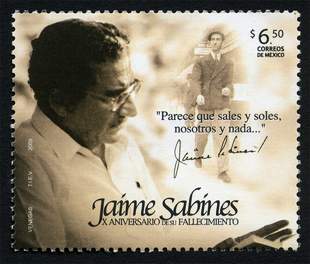 No. Scott: 2658 -- Año de Emisión: 2009 -- Valor Facial: $ 6.50 -- Multicolor -- Perforación: 13 1/4 x 13 -- Tipo de Impresión: OffsetTimbre Postal Mexicano multicolor, al fondo de la imagen se observa a un hombre caminando, él viste un saco oscuro, corbata y pantalón claro, en la cabeza lleva puesto un sombrero atrás de él aparecen dos personas más, en primer plano aparece una fotografía en plano medio corto del poeta mexicano Jaime Sabines, él lleva puesta una camisa color blanco Sobre la estampilla está escrito el valor facial de "$6.50", "CORREOS DE MÉXICO", "Parece que sales y soles , nosotros y nada ...", "Jaime Sabines X ANIVERSASRIO DE SU FALLECIMIENTO" y "VENEGAS, TIEV, 2009".