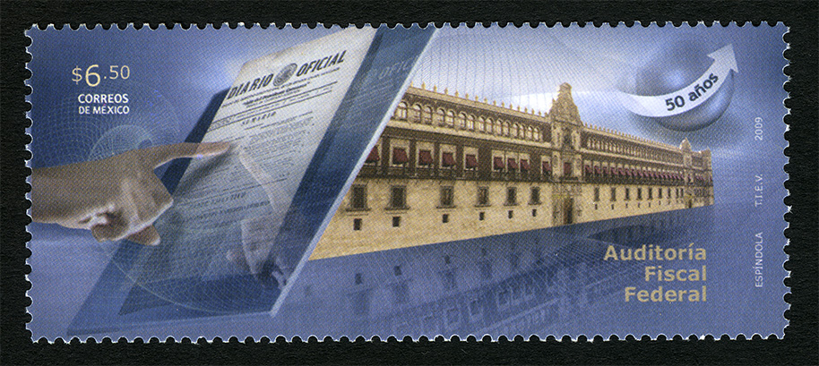 No. Scott: 2659 -- Año de Emisión: 2009 -- Valor Facial: $ 6.50 -- Multicolor -- Perforación: 13 1/4 x 13 -- Tipo de Impresión: Offset Timbre Postal Mexicano multicolor, al fondo de la imagen se observa un edificio antiguo de gran tamaño, con muchos ventanales y arcos, posiblemente esté elaborado de piedra labrada o ladrillos cerámicos, en primer plano aparece una mano humana señalando un documento, cuyo encabezado dice DIARIO OFICIAL. En la estampilla está escrito el valor facial de "$6.50", "CORREOS DE MÉXICO", "50 años", "ESPÍNDOLA, TIEV, 2009" y "Auditoria Fiscal Federal". Para más información favor de dirigirse a biblioteca@mufi.org.mx