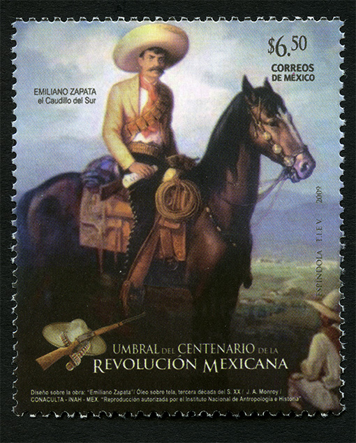No. Scott: 2647 -- Año de Emisión: 2009 -- Valor Facial: $ 6.50 -- Multicolor -- Perforación: 13 x 13 1/4 -- Tipo de Impresión: Offset Timbre Postal Mexicano multicolor, alusivo al Centenario de la Revolución Mexicana, en la imagen aparece la obra "Emiliano Zapata a Caballo" del pintor jalisciense, José Atanasio Monroy, famoso por su temática mexicanista y por sus murales. Sobre la estampilla está escrito el valor facial de "$6.50", "CORREOS DE MÉXICO", "EMILIANO ZAPATA el Caudillo el Sur", "ESPÍNDOLA, TIEV, 2009" y "UMBRAL DEL CENTENARIO DE LA REVOLUCIÓN MEXICANA". Para más información favor de dirigirse a biblioteca@mufi.org.mx