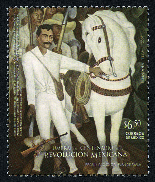 No. Scott: 2649 -- Año de Emisión: 2009 -- Valor Facial: $ 6.50 -- Multicolor -- Perforación: 13 x 13 1/4 -- Tipo de Impresión: OffsetTimbre Postal Mexicano multicolor, alusivo al Centenario de la Revolución Mexicana, en la imagen se observa parte del mural de Diego Rivera titulado "Historia del Estado de Morelos, Conquista y Revolución", en ella se observa a Emiliano Zapata, quien fue un protagonista clave en la Revolución Mexicana, aquí está con un grupo de campesinos armados con objetos improvisados, con las riendas de un majestuoso caballo blanco en la mano, Zapata permanece al lado, en señal de triunfo. En la estampilla está escrito "ESPÍNDOLA, TIEV, 2009", el valor facial de "$6.50", "CORREOS DE MÉXICO", "UMBRAL DEL CENTENARIO DE LA REVOLUCIÓN MEXICANA" y "PROMULGACIÓN DEL PLAN DE AYALA".