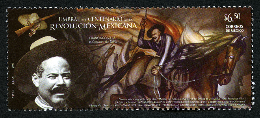 No. Scott: 2652 -- Año de Emisión: 2009 -- Valor Facial: $ 6.50 -- Blanco y Negro -- Perforación: 13 -- Tipo de Impresión: OffsetTimbre Postal Mexicano multicolor alusivo al Centenario de la Revolución Mexicana, en la imagen se observa un mural del artista Aarón Piña Mora, titulado General Francisco Villa el Centauro del Norte, en la parte inferior del lado izquierdo aparece la cara en blanco y negro del personaje mencionado, quien fue un luchador social, bandolero revolucionario, violento e implacable. En la estampilla está escrito "UMBRAL DEL CENTENARIO DE LA REVOLUCIÓN MEXICANA", el valor facial de "$6.50", "CORREOS DE MÉXICO" y "VIVEK, TIEV, 2009".
