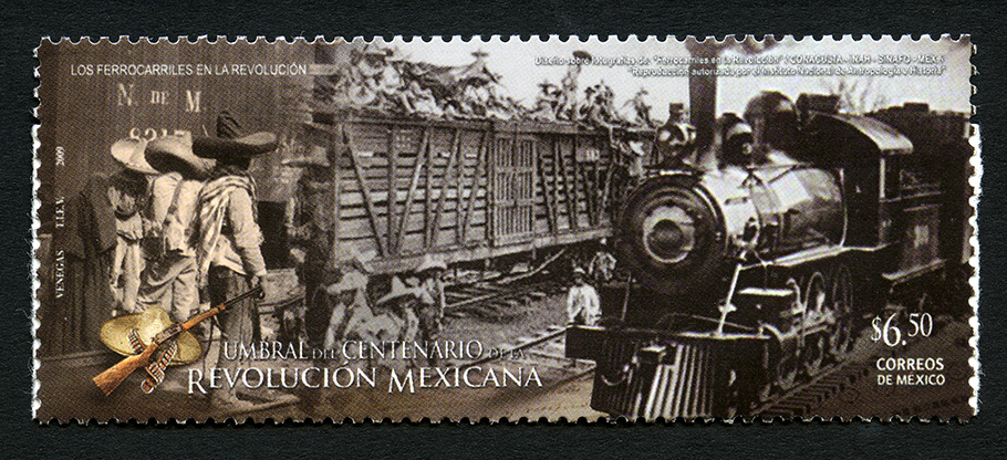 No. Scott: 2653 -- Año de Emisión: 2009 -- Valor Facial: $ 6.50 -- Multicolor -- Perforación: 13 -- Tipo de Impresión: OffsetTimbre Postal Mexicano multicolor, en la imagen aparece una fotografía multicolor, alusivo a los Ferrocarriles de la Revolución Mexicana, en la cual muestra un gran número de personas vestidas con camisa y pantalón de manta, sombreo ancho y paliacate, del lado izquierdo aparece un vagón de tren y encima un gran número de personas que viajan sobre él, del lado derecho aparece una locomotora que arrastra los vagones del tren. Sobre la estampilla está escrito "LOS FERROCARRILES EN LA REVOLUCIÓN", "VENEGAS, TIEV, 2009", "UMBRAL DEL CENTENARIO DE LA REVOLUCIÓN MEXICANA", el valor facial de "$6.50" y "CORREOS DE MÉXICO".
