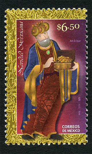 No. Scott: 2660 -- Año de Emisión: 2009 -- Valor Facial: $ 6.50 -- Multicolor -- Perforación: 13 1/4 x 13 -- Tipo de Impresión: Offset Timbre Postal Mexicano multicolor, en la imagen se observa al Rey Melchor, vestido con una túnica roja y un manto o capa color azul con borde en color dorado, en las manos lleva una cajita llena mirra y en la cabeza una corona dorada. Sobre la estampilla está escrito el valor facial de "$6.50", "Melchor", "Navidad Mexicana", "VIVEK, TIEV, 2009" y "CORREOS DE MÉXICO". Para más información favor de dirigirse a biblioteca@mufi.org.mx