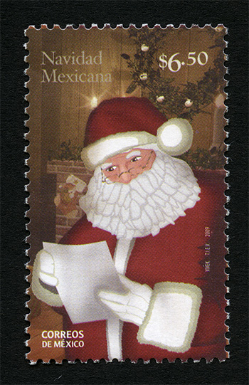 No. Scott: 2663 -- Año de Emisión: 2009 -- Valor Facial: $ 6.50 -- Multicolor -- Perforación: 13 1/4 x 13 -- Tipo de Impresión: OffsetTimbre Postal Mexicano multicolor, en la imagen se observa a Santa Claus, conocido también como Papá Noel, Viejito Pascuero o San Nicolás, son algunos nombres con los que se conoce en el mundo al personaje que según las tradiciones traen regalos a los niños por la navidad, se caracteriza por usar un traje y rojo color rojo, botas y cinturón negro, de aspecto regordete, bonachón y simpático, usa barba frondosa y anteojos. En la estampilla está escrito "Navidad Mexicana", el valor facial de "$6.50", "VIVEK, TIEV, 2009",y "CORREOS DE MÉXICO".