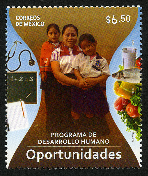 No. Scott: 2664 -- Año de Emisión: 2009 -- Valor Facial: $ 6.50 -- Multicolor -- Perforación: 13 x 13 1/4 -- Tipo de Impresión: Offset Timbre Postal Mexicano multicolor, en la imagen se observan mujeres indígenas, dos niñas y una mujer adulta, ellas son indígenas, al parecer es una mamá con sus dos hijas, las niñas visten uniformes escolares y la madre, ropa típica de alguna comunidad. En la estampilla está escrito "CORREOS DE MÉXICO" el valor facial de "$6.50", "QUEZADA, TIEV, 2009" y "PROGRAMA DE DESARROLLO HUMANO Oportunidades". Para más información favor de dirigirse a biblioteca@mufi.org.mx