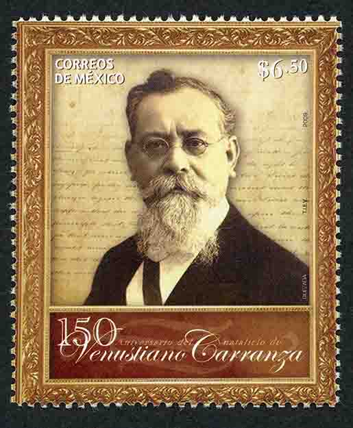 No. Scott: 2667 -- Año de Emisión: 2009 -- Valor Facial: $ 6.50 -- Multicolor -- Perforación: 13 -- Tipo de Impresión: OffsetTimbre Postal Mexicano multicolor, en la imagen se observa se observa un documento escrito con letra cursiva, el cual no es legible, en primer plano y dentro de un rectángulo ornamentado, aparece el retrato de Venustiano Carranza, político, militar y empresario mexicano quien participó en la segunda etapa de la Revolución Mexicana como Primer Jefe del Ejército Constitucionalista. En la estampilla está escrito "CORREOS DE MÉXICO", el valor facial de "$6.50", "QUEZADA, TIEV, 2009" y "150 Aniversario del Natalicio de Venustiano Carranza".