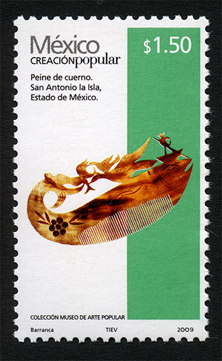 No. Scott: 2490d -- Año de Emisión: 2009 -- Valor Facial: $ 1.50 -- Multicolor -- Perforación: 13 1 /4 x 13 -- Tipo de Impresión: Offset EstucadoTimbre Postal Mexicano multicolor, perteneciente a la serie permanente México Creación Popular, en la imagen aparece un peine de cuerno en forma de pez, en la parte de arriba aparecen figuras de animales marinos y al extremo aparece la silueta de un hombre, dentro de una balsa, esta pieza fue realizada en el municipio de San Antonio la Isla, Estado de México. Sobre la estampilla está escrito "México CREACIÓN POPULAR", el valor facial de "$1.50", "Peine de cuerno. San Antonio la Isla, Estado de México", "COLECCIÓN MUSEO DE ARTE POPULAR" y "Barranca, TIEV, 2009".