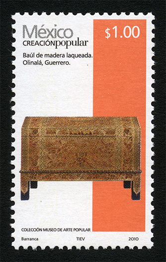 No. Scott: 2489d -- Año de Emisión: 2010 -- Valor Facial: $ 1.00 -- Multicolor -- Perforación: 13 1 /4 x 13 -- Tipo de Impresión: Offset Estucado Timbre Postal Mexicano multicolor, perteneciente a la serie permanente México Creación Popular, en la imagen aparece un baúl de madera laqueada, en colores café y naranja, con decorado artístico, esta pieza fue realizada en el municipio de Olinalá, perteneciente al estado de Guerrero. Sobre la estampilla está escrito "México CREACIÓN POPULAR", el valor facial de "$1.00", "Baúl de madera laqueada, Olinalá, Guerrero", "COLECCIÓN MUSEO DE ARTE POPULAR" y "Barranca, TIEV, 2010". Para más información favor de dirigirse a biblioteca@mufi.org.mx