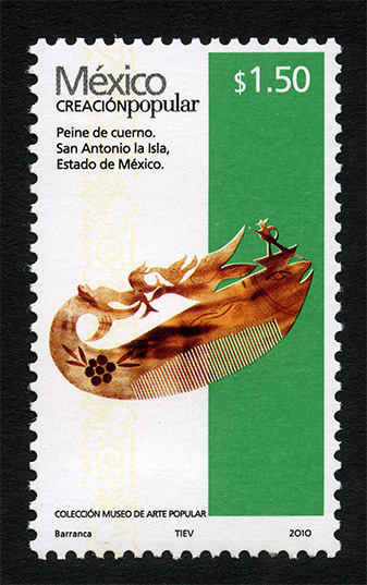 No. Scott: 2490e -- Año de Emisión: 2010 -- Valor Facial: $ 1.50 -- Multicolor -- Perforación: 13 1 /4 x 13 -- Tipo de Impresión: Offset EstucadoTimbre Postal Mexicano multicolor, perteneciente a la serie permanente México Creación Popular, en la imagen aparece un peine de cuerno en forma de pez, en la parte de arriba aparecen figuras de animales marinos y al extremo aparece la silueta de un hombre, dentro de una balsa, esta pieza fue realizada en el municipio de San Antonio la Isla, Estado de México. Sobre la estampilla está escrito "México CREACIÓN POPULAR", el valor facial de "$1.50", "Peine de cuerno. San Antonio la Isla, Estado de México", "COLECCIÓN MUSEO DE ARTE POPULAR" y "Barranca, TIEV, 2010".