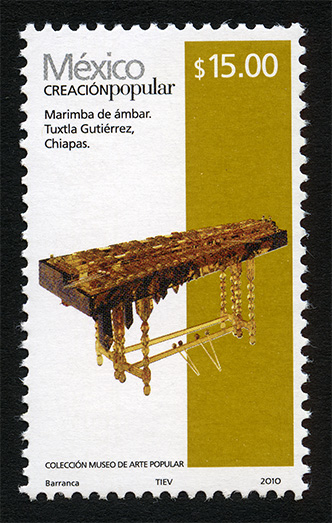 No. Scott: 2504d -- Año de Emisión: 2010 -- Valor Facial: $ 15.00 -- Multicolor -- Perforación: 13 1 /4 x 13 -- Tipo de Impresión: Offset Estucado Timbre Postal Mexicano multicolor, perteneciente a la serie permanente México Creación Popular, en la imagen se observa un instrumento de percusión auditivo elaborado de ámbar y decorado artísticamente, mismo fue realizado en el estado de Chiapas. Sobre la estampilla está escrito "México CREACIÓN POPULAR", el valor facial de "$ 15.00", "Marimba de ámbar. Tuxtla Gutiérrez, Chiapas", "COLECCIÓN MUSEO DE ARTE POPULAR" y "Barranca, TIEV, 2010". Para más información favor de dirigirse a biblioteca@mufi.org.mx