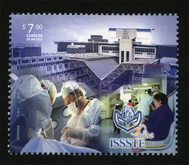 No. Scott: 2669 -- Año de Emisión: 2010 -- Valor Facial: $ 7.00 -- Multicolor -- Perforación: 13 1 /4 x 13 -- Tipo de Impresión: OffsetTimbre Postal Mexicano multicolor, al fondo de la imagen y en la parte superior aparece el interior del edificio del ISSSTE de la Ciudad de México, en primer plano y del lado izquierdo, se observa a un grupo de doctores vestidos con ropa quirúrgica, en mi opinión están realizando alguna cirugía, del lado derecho hay un pasillo con varias personas, hay unas señoras sentadas, una enfermera que está de espaldas y un señor caminando, también esta impreso en emblema del ISSSTE 50 años. En la estampilla está escrito el valor facial de "$7.00", "CORREOS DE MÉXICO" y "VENEGAS, TIEV, 2010".