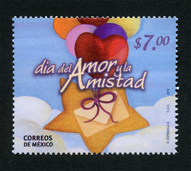No. Scott: 2670 -- Año de Emisión: 2010 -- Valor Facial: $ 7.00 -- Multicolor -- Perforación: 13 1 /4 x 13 -- Tipo de Impresión: Offset Timbre Postal Mexicano multicolor, en la imagen se observa una ilustración infantil, al fondo hay un cielo azul con nubes, en medio aparecen corazones y globos de colores, al frente una estrella en color amarillo, encima un sobre blanco y sobre de él un moño. En la estampilla está escrito el valor facial de "$7.00", "día del Amor y la Amistad", "R. ESPÍNDOLA, TIEV, 2010" y "CORREOS DE MÉXICO". Para más información favor de dirigirse a biblioteca@mufi.org.mx