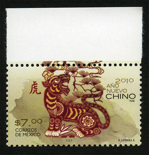 No. Scott: 2671 -- Año de Emisión: 2010 -- Valor Facial: $ 7.00 -- Multicolor -- Perforación: 13 x 13 1/4 -- Tipo de Impresión: Offset Timbre Postal Mexicano multicolor con borde que abarca parte de la imagen, mismo que hace alusión al Año Nuevo Chino 2010, en la ilustración se observa a un tigre, elaborado posiblemente de metal, pintado de muchas formas y figuras, en la cual dominan los colores rojo óxido, beige y oro. En la estampilla está escrito el valor facial de "$7.00", "CORREOS DE MÉXICO" y "TIEV, R. ESPÍNDOLA B.". Para más información favor de dirigirse a biblioteca@mufi.org.mx