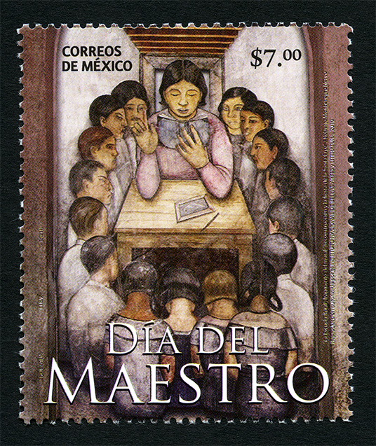 No. Scott: 2676 -- Año de Emisión: 2010 -- Valor Facial: $7.00 -- Multicolor -- Perforación: 13 x 13 1/4 -- Tipo de Impresión: Offset Timbre Postal Mexicano multicolor, dentro de una habitación y al centro de la imagen, se observa una mesa, al frente hay una mujer sosteniendo un libro con una mano, como si estuviera leyendo, sus codos estás sobre la mesa, alrededor hay un gran número de niños que permanecen atentos a lo que les está diciendo. Sobre la estampilla está escrito "CORREOS DE MÉXICO", el valor facial de "$7.00", "TIEV, 2010" y "DÍA DEL MAESTRO". Para más información favor de dirigirse a biblioteca@mufi.org.mx