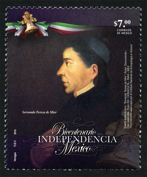No. Scott: 2686 -- Año de Emisión: 2010 -- Valor Facial: $ 7.00 -- Multicolor -- Perforación: 13 x 13 1/4 -- Tipo de Impresión: OffsetTimbre Postal Mexicano multicolor, alusivo al Bicentenario de la Independencia de México, sobre un fondo color negro, se observa el busto de perfil de Fray Servando Teresa de Mier, quien fue un sacerdote liberal y escritor de numerosos tratados sobre filosofía política de la Nueva España, él trae puesto una cogulla en color negro y cuello blanco, en la cabeza trae puesto una tonsura negra. En la estampilla está escrito el valor facial de "$7.00", "CORREOS DE MÉXICO", "VENEGAS, TIEV, 2010" y "Bicentenario de la INDEPENDENCIA de México".