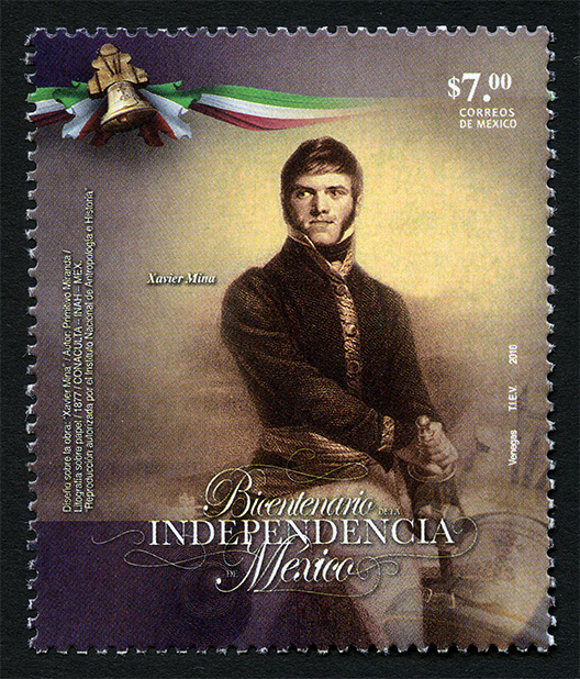 No. Scott: 2687 -- Año de Emisión: 2010 -- Valor Facial: $ 7.00 -- Multicolor -- Perforación: 13 x 13 1/4 -- Tipo de Impresión: OffsetTimbre Postal Mexicano multicolor, alusivo al Bicentenario de la Independencia de México, en la imagen se observa a Xavier Mina, quien fue militar y guerrillero español que participó en la Guerra de la Independencia de España, en contra de los españoles, él permanece parado, tiene puesto un pantalón largo blanco, con un saco negro, tiene puesta una faja en color claro y ambas manos están sujetando una espada. En la estampilla está escrito el valor facial de "$7.00", "CORREOS DE MÉXICO", "VENEGAS, TIEV, 2010" y "Bicentenario de la INDEPENDENCIA de México".