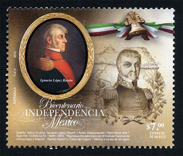 No. Scott: 2691 -- Año de Emisión: 2010 -- Valor Facial: $ 7.00 -- Multicolor -- Perforación: 13 1/4 x 13 -- Tipo de Impresión: OffsetTimbre Postal Mexicano multicolor, alusivos al Bicentenario de la Independencia de México, al fondo se observa un cerro o colina de poca altura, al frente aparecen los retratos de Ignacio López Rayón y de Ramón Rayón, ambos participaron en la guerra de la Independencia, el primero organizó la Suprema Junta Gubernativa de América y el segundo participó en las batallas a partir de la toma de Guadalajara. En la estampilla está escrito, "ESPÍNDOLA, TIEV, 2010", "Bicentenario de la INDEPENDENCIA de México", el valor facial de "$7.00" y "CORREOS DE MÉXICO".